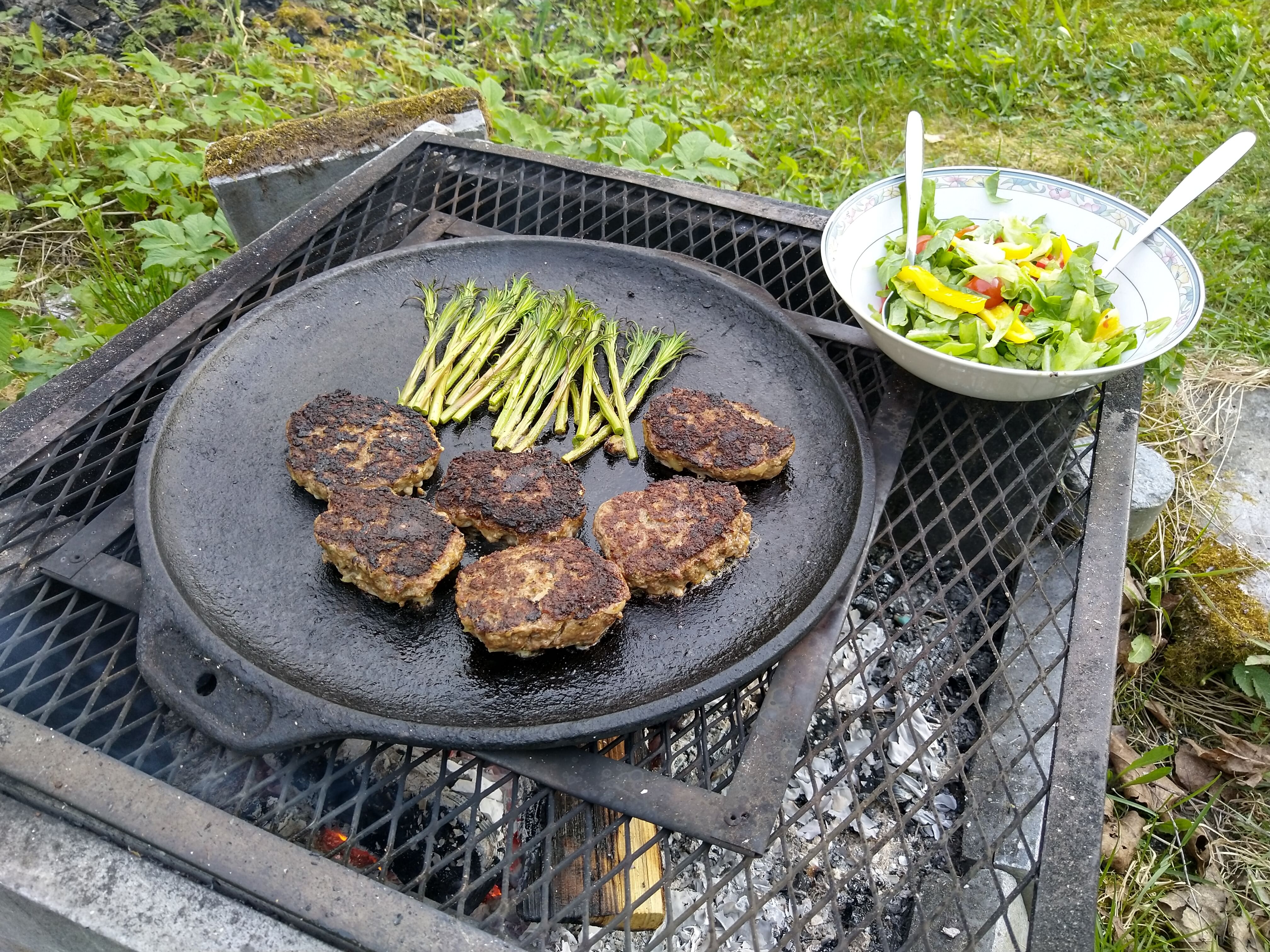 Organic beef burgers, porcine sauce, campfire potatoes