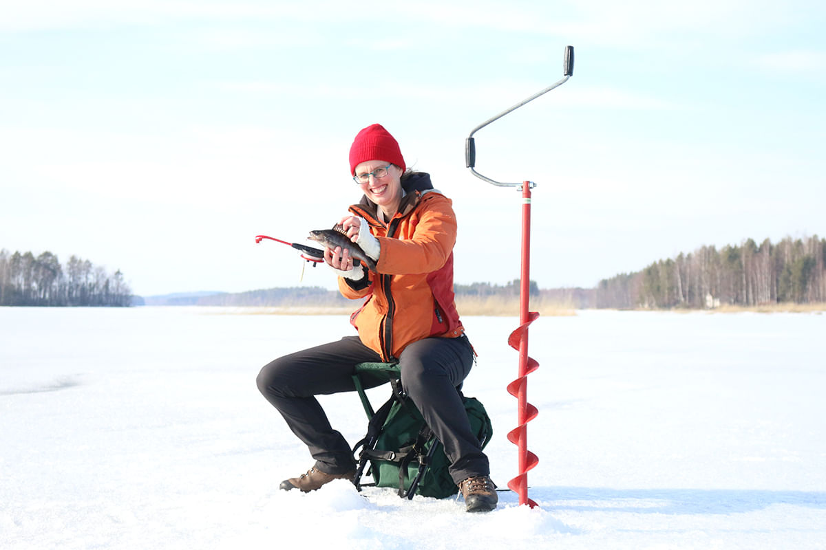 Full fishing gear with baits, guide services and a hot drink. If needed you can borrow winter overalls and shoes.