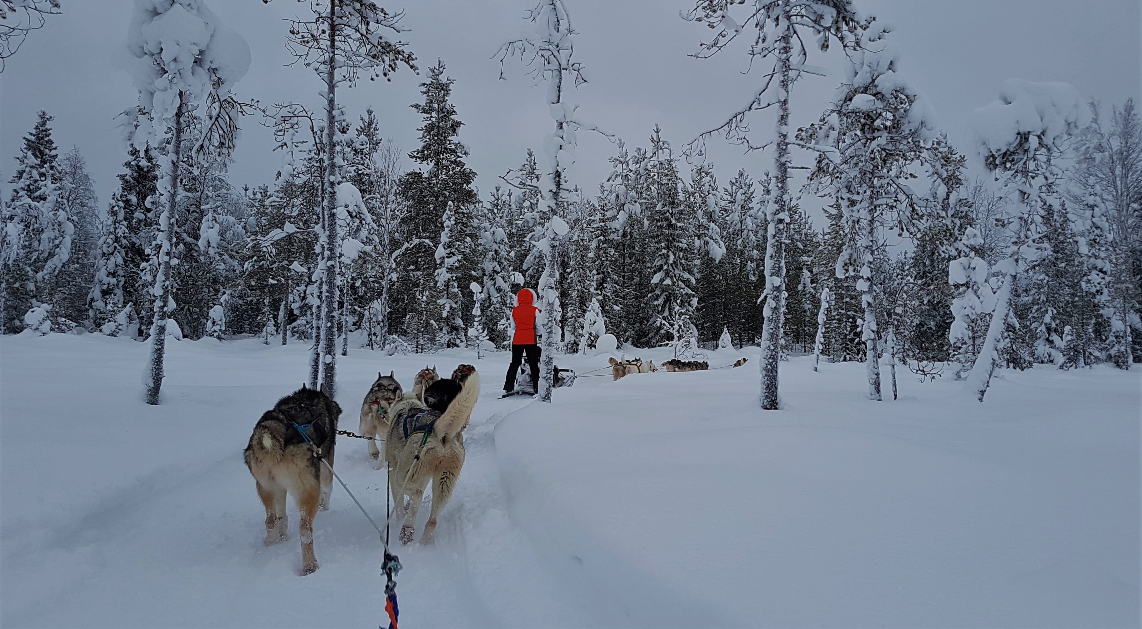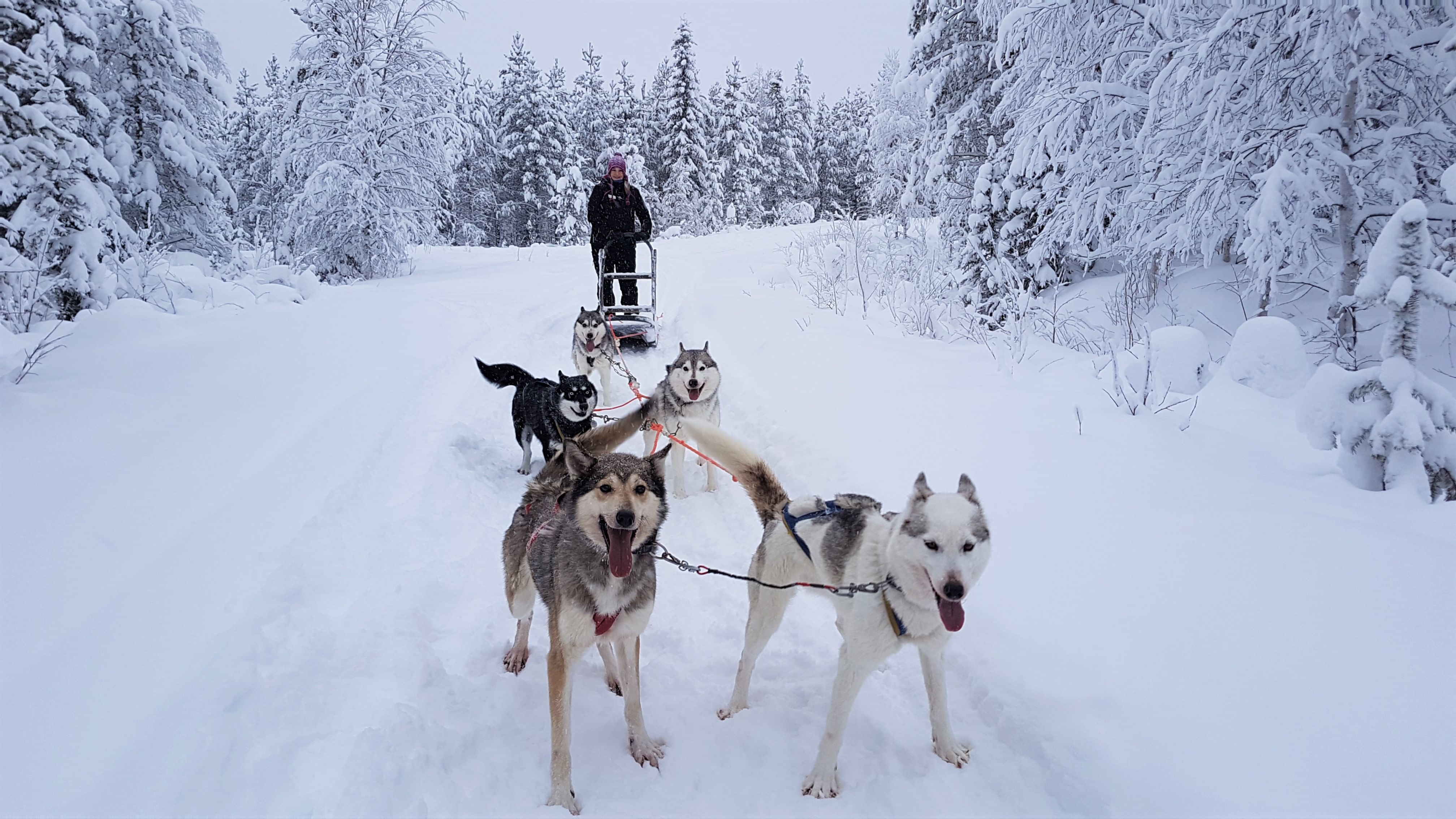 Visit a small, family-owned husky farm, meet the dogs and take a 5 kilometre sledge-dog safari.