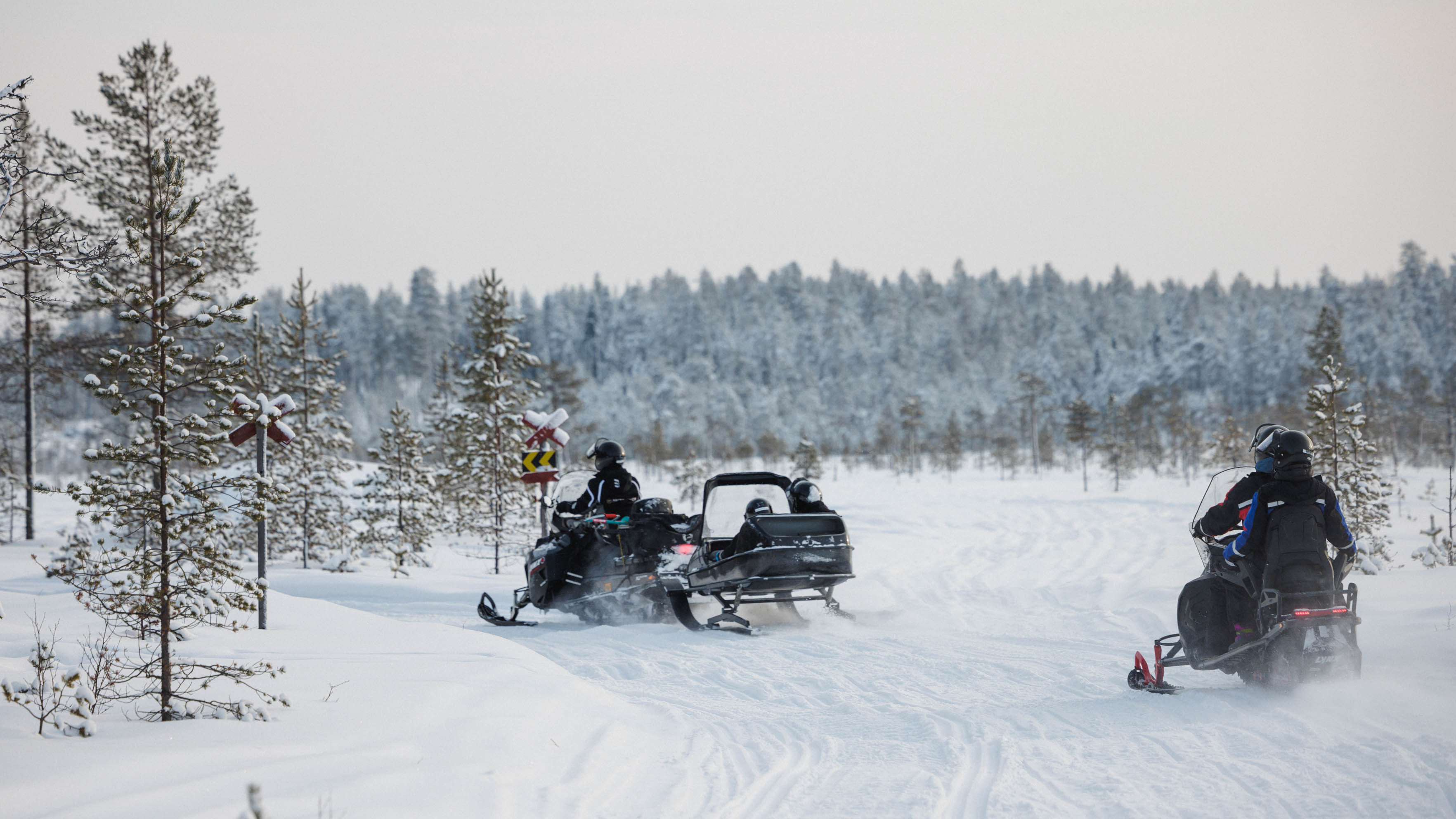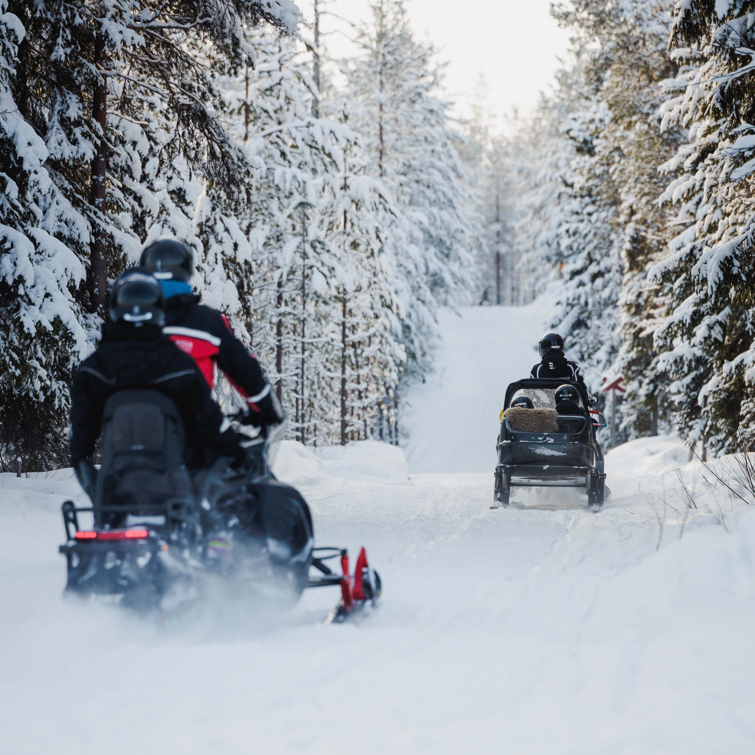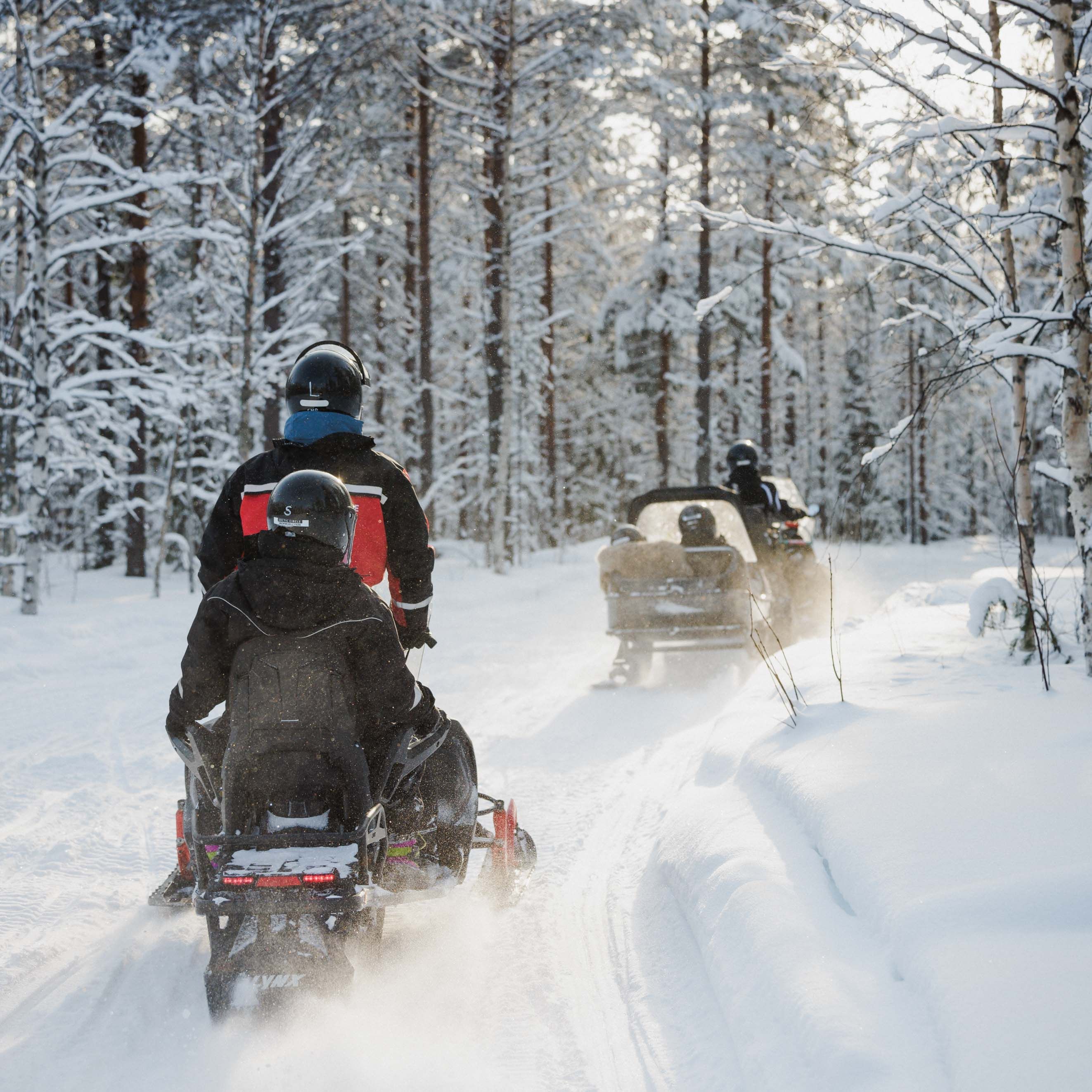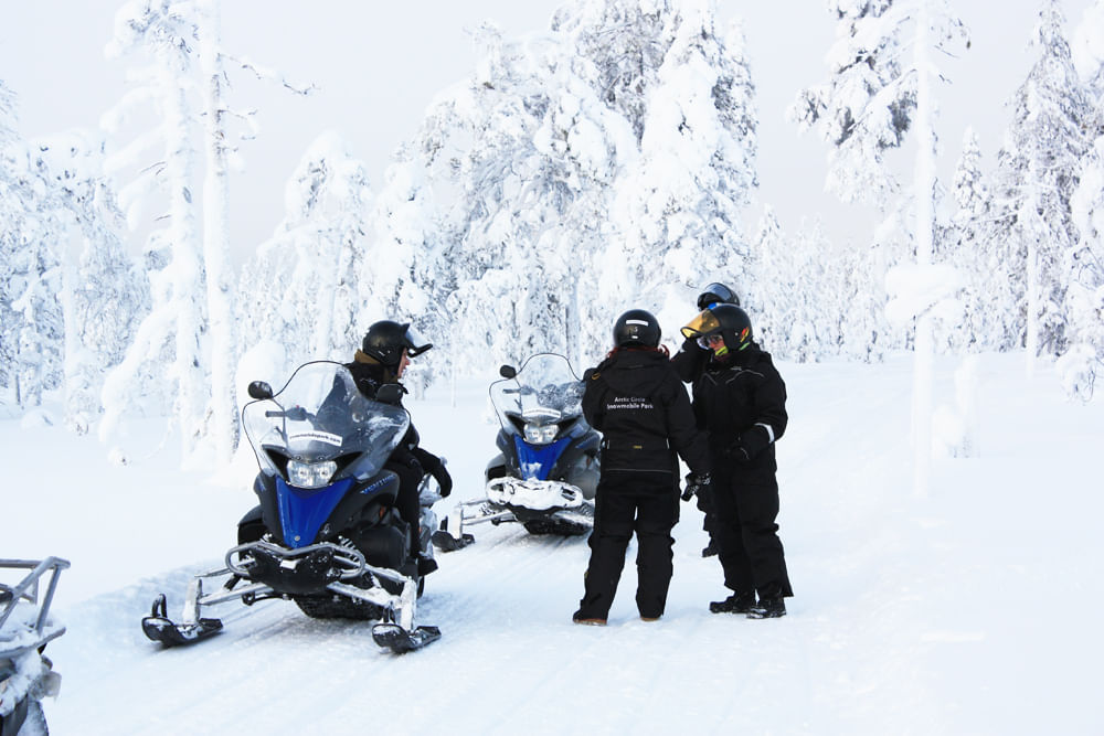 Join in on a Snowmobile Safari in Lapland through remote inland forests and lakes. On this 1-hour driving snowmobile safari, you will enjoy some amazing scenery. You will be transported by bus to our Snowmobile Park in the Arctic circle. An expert guide will then take you 1 hour through an unforgettable trail in the Arctic Arctic Circle area. You will be driving in pairs, one driver and one passenger on each snowmobile, with the opportunity to switch places during the trip. Due to the dramatic topography, a reduced speed is held during parts of the tour. You will love the thrilling excitement of snowmobiling through snowy forests and beautiful nature of the Arctic Circle, in Rovaniemi. Our group sizes are small and the speed and the length of the safari depend on each group. Therefore, these safaris are suited for families as well as for those who are looking for a real adrenaline boost. The one-hour safari is one of our most popular safaris and great for families and non-experienced drivers. The snowmobile trail will take you to the most beautiful places in the arctic circle area! The snowmobile safari takes you to deeper into Rovaniemi wilderness. The guide will provide you with safety instructions about driving.