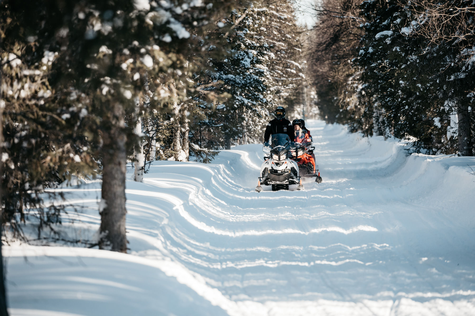 Each snowmobile is shared by two guests taking turns in driving. The driver of the snowmobile has to be at least 18 years of age with a driver’s license valid in Finland. Driving a motorized vehicle under the influence of alcohol or intoxicating drugs is prohibited by the laws of Finland.