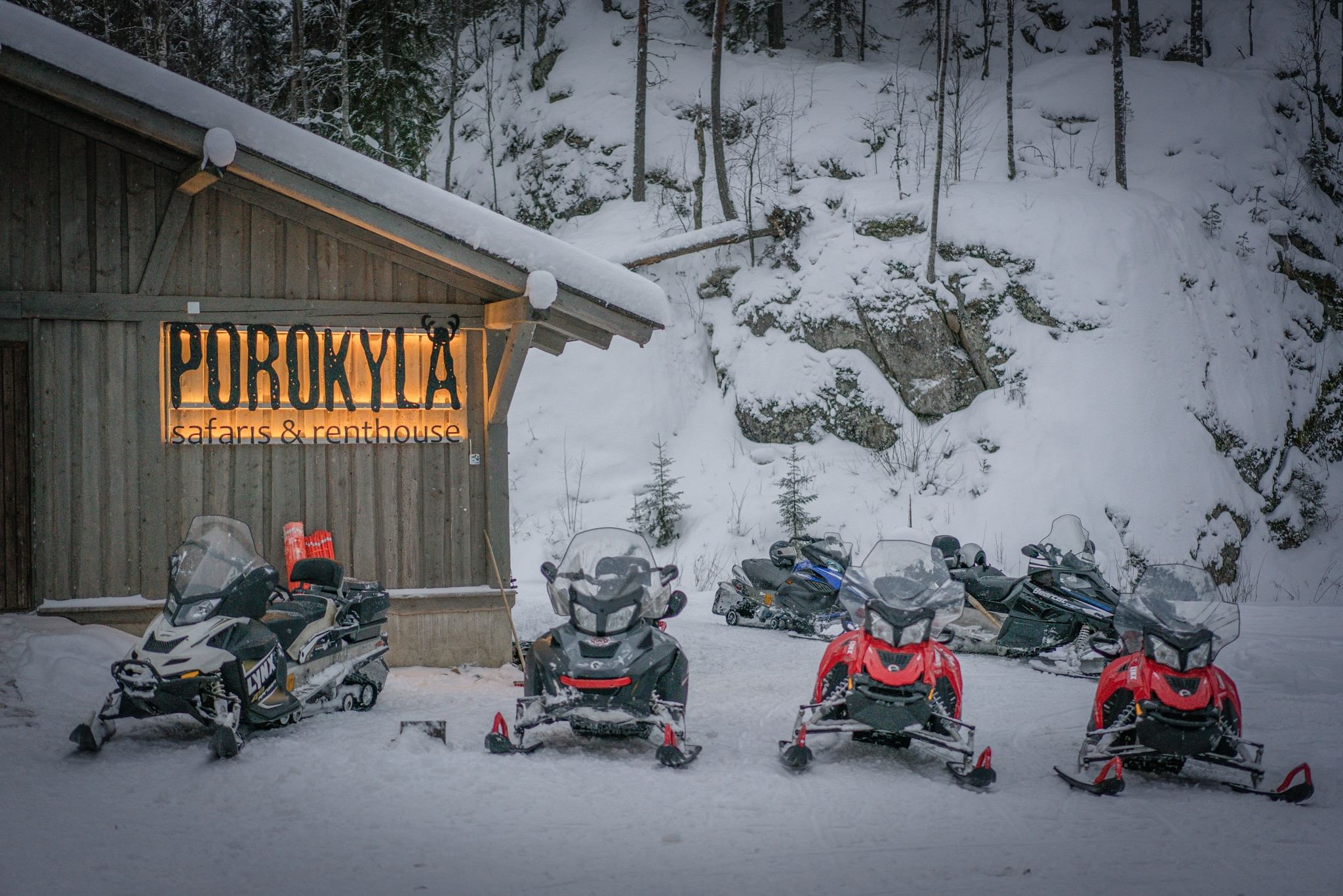 During this guided tour you will learn the basics about snowmobiling and visit our lovely reindeer. Our guide will pick you up from Järvisydän and we head off to Porokylä the Reindeer village. Safari starts with outfitting in Porokylä’s safari house and the basic safety training for the safari. Safari route goes through the old forests of Porosalmi in varying terrain. This safari is suitable for beginners and the guide regulates the pace according to the group. At the end of the safari, you can meet our reindeer and feed them. A warm drink is served during the program.