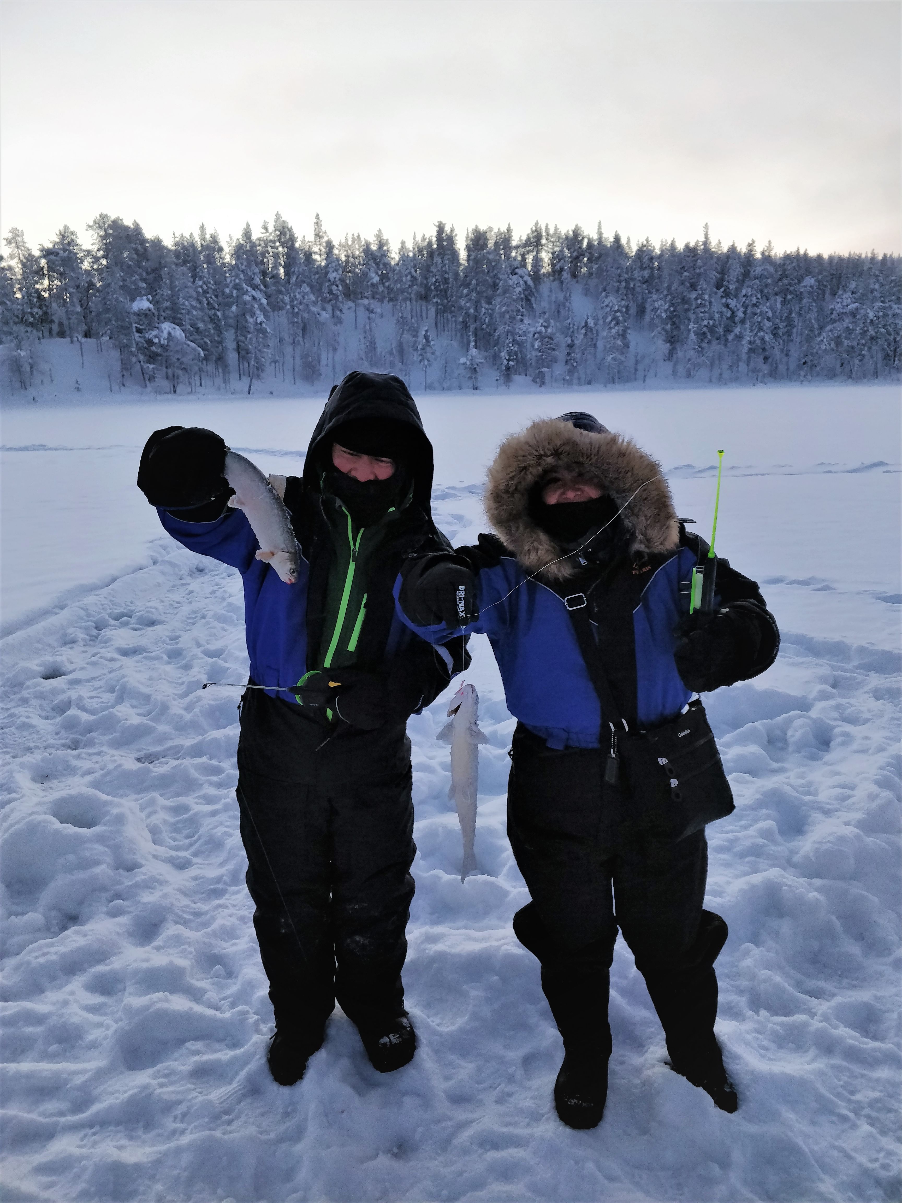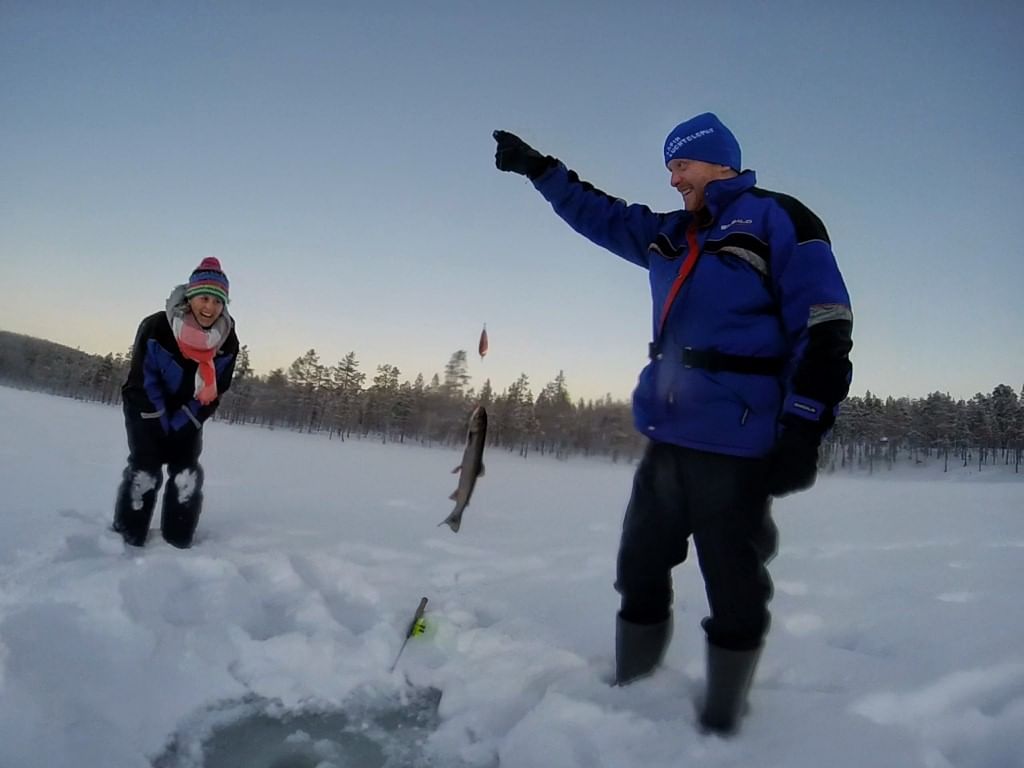 This half-day safari starts by snowmobile from Lapin Luontoloma rental office in Saariselka (Lutontie 3, Saariselkä) at 9:45 am. You will get all equipment needed during the trip and snowmobiling instructions. After that, we drive 12 km across the beautiful Arctic wilderness towards our private lake called Taimenjarvi. You will get instructions to ice fishing and can try catching fish through a hole in the ice.
