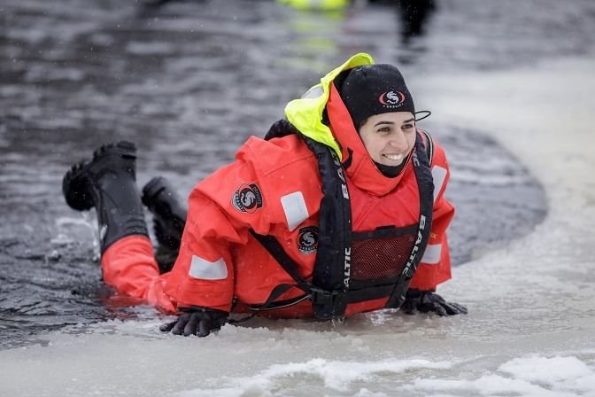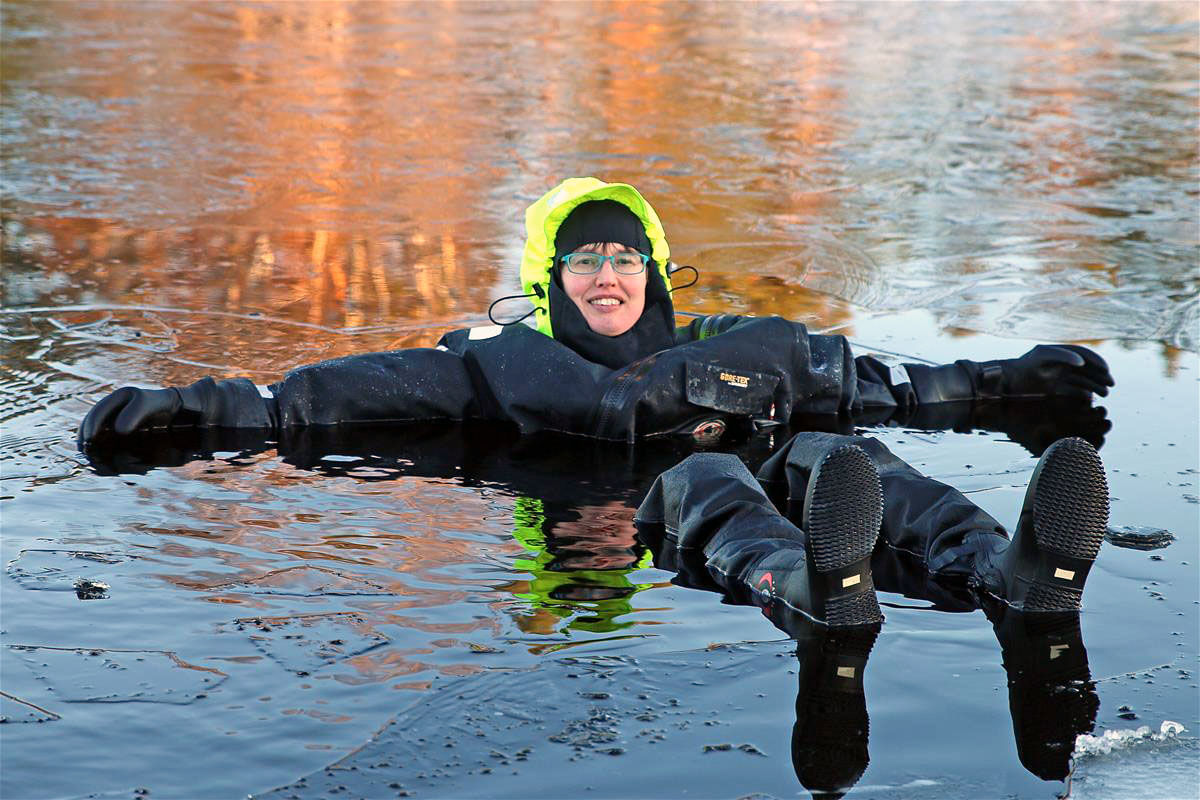 A drysuit floating among ice. Swimming skills and age of 12 required for this fun winter activity.