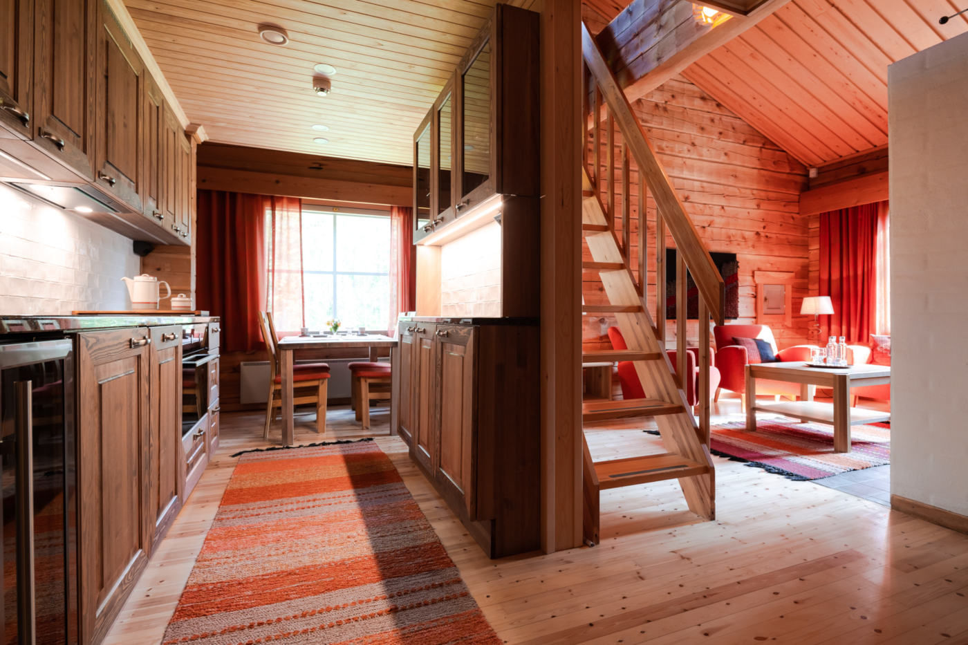 Sundaymorning resort is a tiny, very comfortable hotel in the wilderness but not far from the Pyhä ski village. They only have 8 hotel rooms and 4 cabins, all in all 24 seats only. You will stay in a comfortable log cabin with a master bedroom and two beds on loft. On your first night sauna and a hot tub outdoors will be in your private disposal on one day for 2 hours. This kind of privacy combined with great food and friendly service will make your holiday enjoyable.